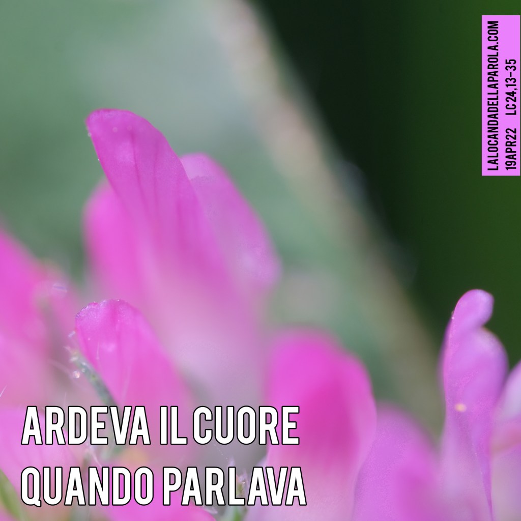 Non ci ardeva forse il cuore nel petto mentre ci spiegava le Scritture? Resta con noi, Signore, continua a spiegarci le tue stesse parole, le uniche che valga la pena di ascoltare. Resta con noi e parlaci, mentre camminiamo. Aprici gli occhi sulla vita, sul senso delle cose, sul bene che possiamo compiere. Che ogni nostra parola non sia nostra, ma tua. Resta con noi, trasforma ogni cena e ogni locanda (anche questa) in pulpito divino che faccia ardere il cuore e riprendere la corsa di chi ti segue ed ha bisogno di una sosta che lo nutra.
