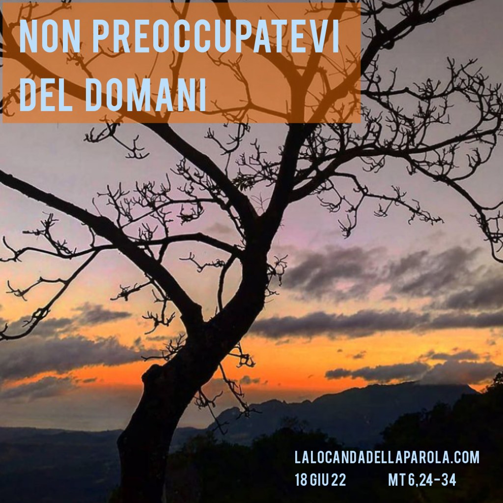 Non preoccupatevi, semmai occupatevi. Non vivete una vita sincopata, fuori tempo, anticipando il domani ad oggi. State nel presente, nell’adesso. Non preoccupatevi dunque del domani, occupatevi dell’oggi. La vostra pena, la vostra fatica, sia aderire adesso al regno di Dio e alla sua giustizia. Cioè ragionare e agire come il vangelo insegna.