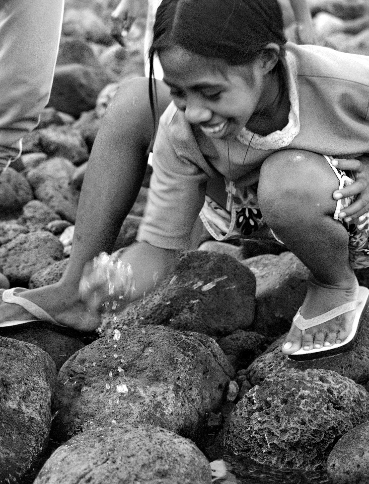 da Maquili, ATAÙRO, TIMOR EST Che bella questa ragazzina di Maquili, pronta a cogliere il momento propizio. Quando il mare cala assieme al sole, la sera, e scopre le rocce fumanti di “bee manas”, acqua calda. Allora si va a staccare dalle pietre minuscole lumache di mare e le si immerge nelle pozze bollenti, a cuocere. Poi, con un colpo più veloce del calore, si recupera il cibo contenti. È l’occasione di mangiare qualcosa e di giocare ad un tempo. Sono attimi che seminano nel cuore di questi bambini una parola ai nostri ormai sconosciuta: semplicità. Come la povera Salomè, i nostri sono immersi troppo presto nel ribollire della vita adulta, fatta d’apparenza e commensali giudicanti. Qui invece la vita è spesso breve e non offre molti appoggi. Si impara a stare in equilibrio sui sassi scivolosi, sapendo d’esser sempre appesi a un filo, come quello di cotone che la bimba porta al collo. Nel 2018 portai qui delle crocine, acquistate anni prima in un carcere boliviano. Non mi aspettavo di rivederle lì dove le avevo lasciate, sul cuore dei bambini. Perché, in fondo, altro non hanno che la croce della miseria fatta d’alimentazione scarsa, di scuola lontana ore di cammino sugli scogli, con il mostro del consumismo che li attende all’altra sponda, a Dili, per decapitarne l’innocenza con un colpo di internet. Eppure, non mento, non mi hanno chiesto nulla se non che di salutarvi.
