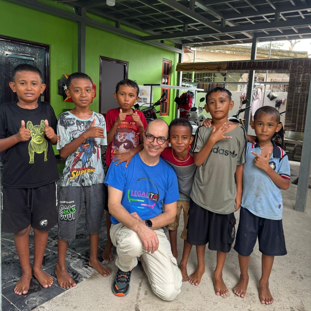 Ieri sono arrivato a Dili, Timor Est, e il comitato d’accoglienza era questo. Erano appena venuti a restituire la nostra carriola, presa in prestito per andare a raccattare legna lungo la strada. Pioveva fortissimo, come vedete dai loro volti bagnati, ma loro la prendevano senza problemi. Chiedevano quando inizieranno i corsi di inglese perché vogliono iscriversi tutti…